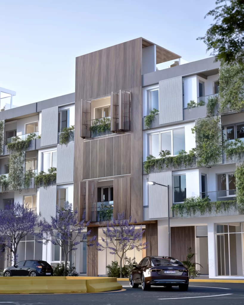 Parasoles móviles, piel vegetal, balcones verdes y materiales nobles componen una arquitectura que responde al clima sanjuanino. Umbra se adapta, se abre, se protege. Vive.